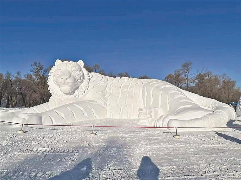 而“雪域之王”老虎雪雕,无疑是“巨兽家园”的压轴亮点。巨型雪虎慵懒地趴卧在雪地上,虎纹雕刻尽显王者风范,阳光洒落时,雪的冷冽和老虎的威猛完美相融。游客站在雪虎旁,小小的身形与虎的庞大形成鲜明反差,仿佛成了闯入雪域巨兽国度的小小访客。