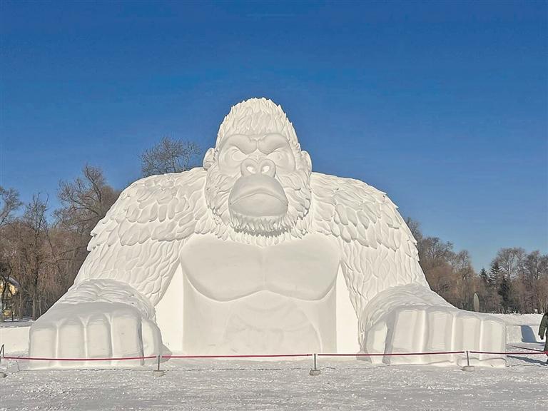 继续向前走,霸气侧漏的巨猩雪雕矗立眼前。浑身棱角分明的肌肉线条,搭配撑地的粗壮手臂,威严沉稳的眼神仿佛在守护这片雪之领地。