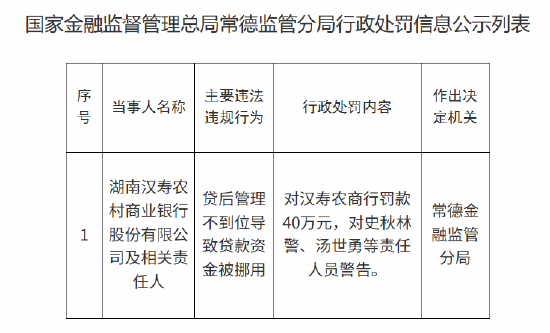 12月26日金融一线消息,据国家金融监督管理总局常德监管分局行政处罚信息公示列表显示,湖南汉寿农村商业银行股份有限公司因贷后管理不到位导致贷款资金被挪用,被罚款40万元。同时,史秋林警、汤世勇等责任人员被警告。