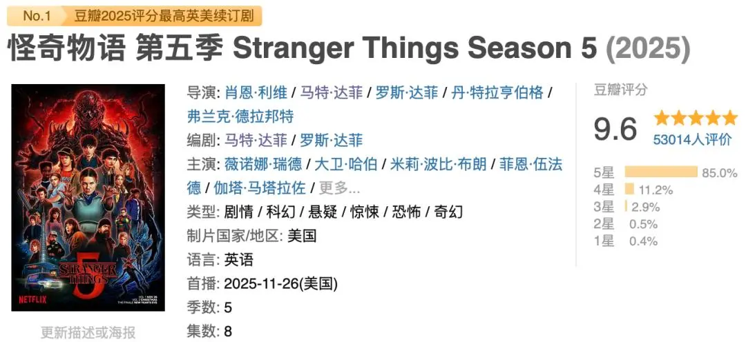 △ 《怪奇物语5》拿下豆瓣2025年评分最高英美续订剧榜首